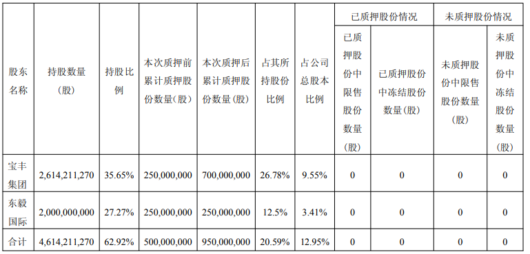 宝丰能源7月6日发布了一份关于控股股东股权质押的公告显示截止到该日期宝丰集团持有的股票数量为2.6142亿股,持股比增值税专用发票上注明的价款含税吗【代办电话13434104765;QQ2188982664】率为35.65%,所持股份中累计质押股票数为7000万股,占其所持有公司股票的比例约为26.78%,占公司总股本的比例约为9.55%。宝丰集团及其一致行动人东毅国际合计持有4.614亿股,持股比例为62.92%,累计质押的股份总数为9500万股,所持股份占比的20.59%,占公司总股本的12.95%。